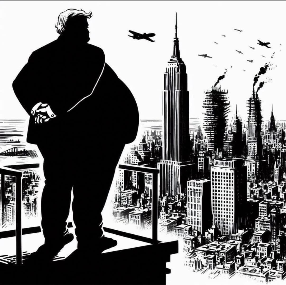 Immagine: Disegno stilizzato di Trump che osserva dall'alto la distruzione di New York. E' utilizzata come immagine portante nel post citato, ma non siamo riusciti a individuare l'autore.