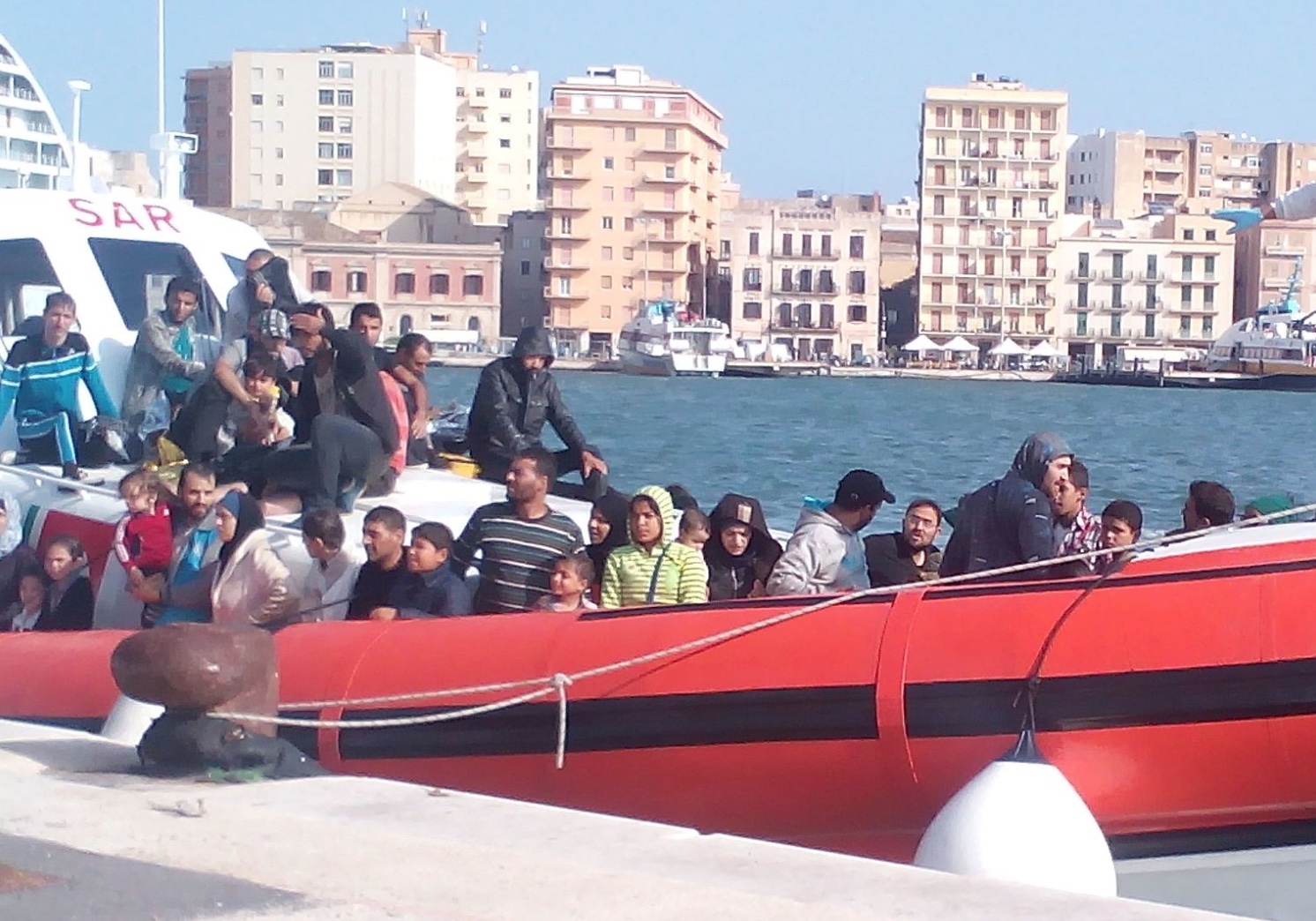 Foto: Sbarco di migranti al porto di Trapani su una vedetta SAR (ricerca e soccorso in mare) della Guardia costiera nell'ottobre 2014 Wikimedia Commons
