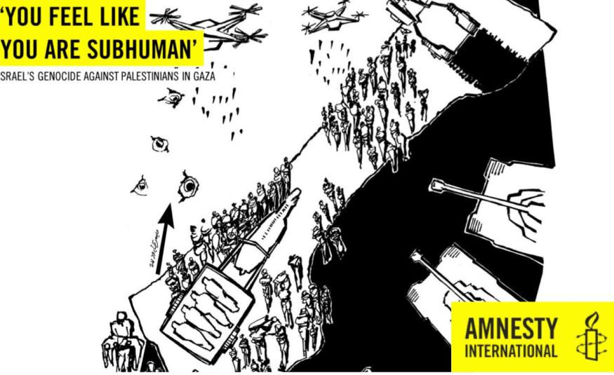 Amnesty International ha concluso che Israele sta commettendo genocidio contro i palestinesi nella Striscia di Gaza. Il rapporto “You Feel Like You Are Subhuman” analizza le azioni militari israeliane, in risposta agli attacchi di Hamas del 7 ottobre 2023, evidenziando gravi violazioni dei diritti umani. Amnesty sostiene che Israele ha intrapreso atti proibiti dalla Convenzione sul Genocidio, come uccisioni, gravi danni fisici e mentali e condizioni di vita finalizzate alla distruzione fisica dei palestinesi.