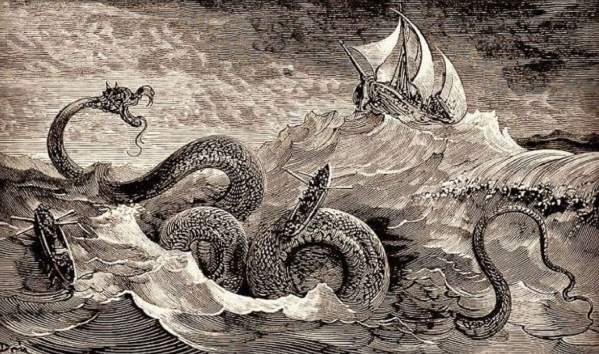 Immagine: Illustrazione ottocentesca di Jörmungandr, noto anche come il Leviatano o il Serpente di Midgard: un essere gigantesco della mitologia norvegese. Fglio di Loki, il dio dell’inganno, è destinato a essere uno dei principali artefici della fine del mondo.